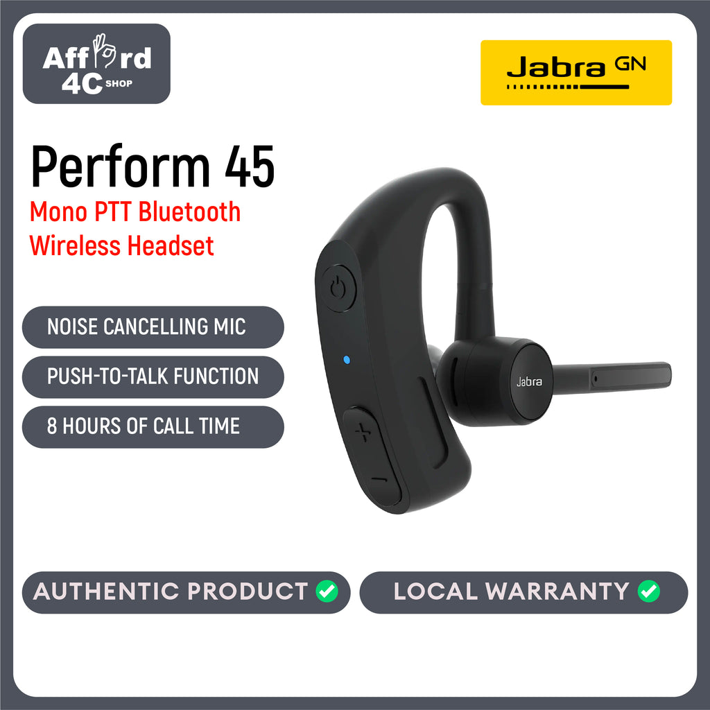 1x Jabra Perform 45 ear hook Bluetooth mono headset with mic, EarGels in 3 sizes, and USB-C to USB-A charging cable