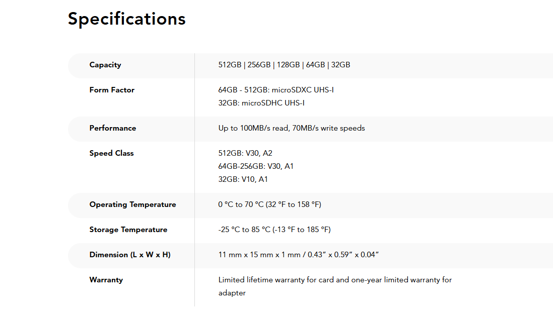 The cards are speed rated at Class 10, and leverage UHS-I technology to deliver a transfer speed up to 100MB/s 2. These high-capacity cards give you the speed and space you need to capture, transfer, and share more adventures on the go.