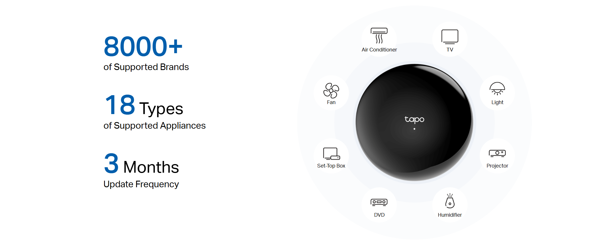 Take control of all your infrared appliances with a single device, including air conditioners, TVs, fans, lights, and set-top boxes. Eliminate the hassle of juggling multiple remotes—no more lost remotes or dead batteries to worry about. With exceptional compatibility, this hub controls even your older appliances. It supports 18 device types and over 8,000 brands, covering all your needs. The compatibility database is updated every 3 months to ensure support for the latest models.