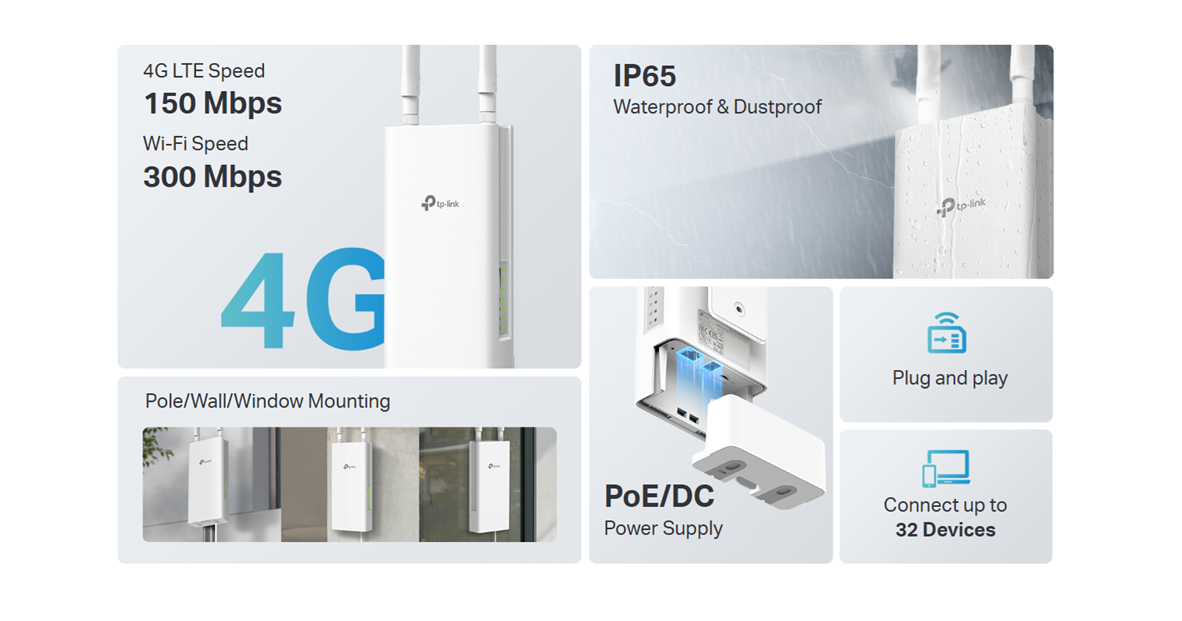 The TL-MR100-Outdoor supports 4G LTE for internet download speeds up to 150 Mbps, paired with fast Wi-Fi speeds of up to 300 Mbps, enabling seamless networking experience.* Simply insert your SIM card to enjoy reliable internet indoors and outdoors.